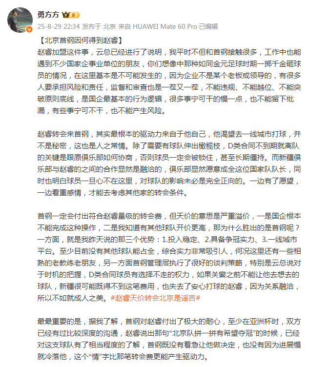 “除了需要有球队伸出橄榄枝,D类合同不到期就离队的关键是跟原俱乐部如何协商,否则球员一定会被锁住,甚至长期僵持。而新疆俱乐部与赵睿的之间的合作显然是融洽的,俱乐部显然愿意成全这位国家队队长,同时也明白球员一旦心不在这里,对球队的影响未必是完全正向的。一边有了愿望,一边看重感情,才能去考虑其他家的转会条件。”